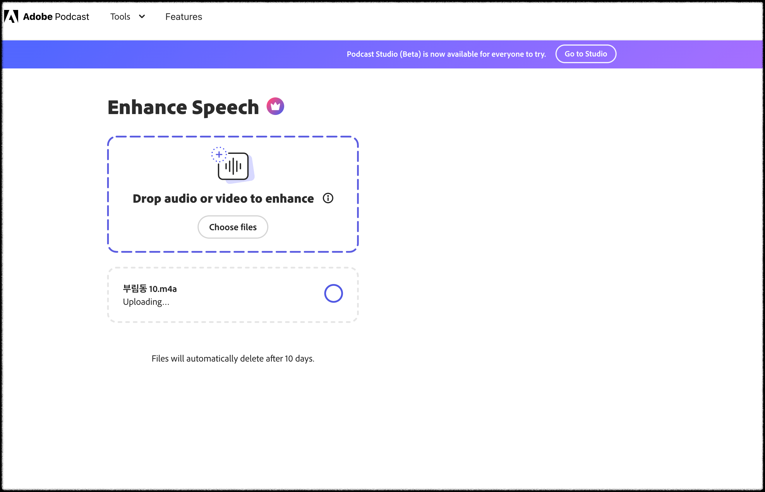 위에서 알려드린 AI 어도비 팟캐스트 링크로 들어가서 버튼을 누르고 녹음 파일을 업로드해주세요.