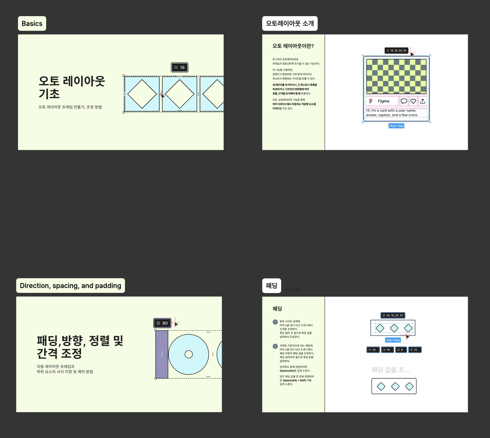 패딩, 간격, 정렬, 단독 객체, 오토레이아웃 제안 등 모든 내용을 다 담았습니다.