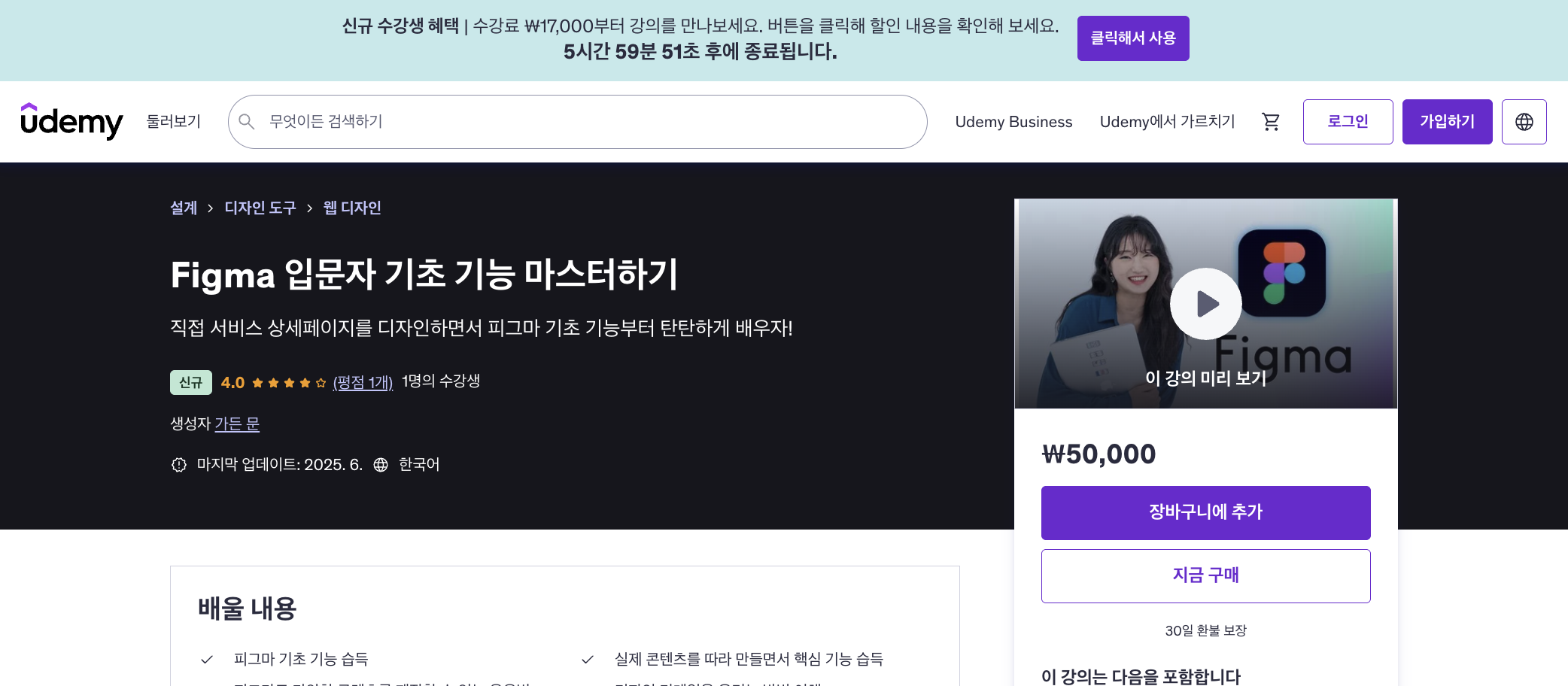그리고 유데미를 통해 처음 강의를 듣는 분들은 17,000원에 강의를 수강할 수 있고