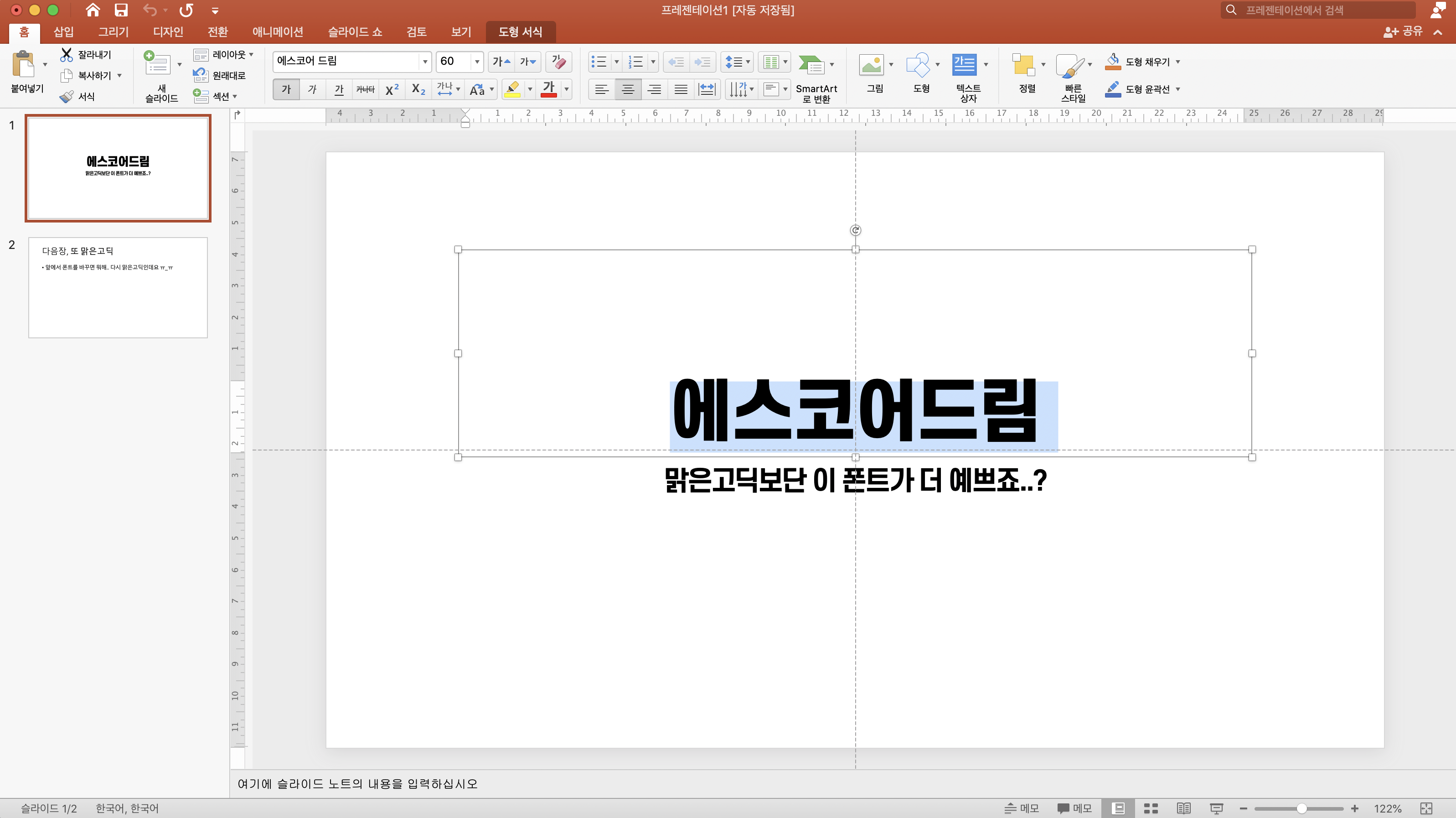 그 다음 2번째 장에서 앞서 서식복사한 폰트를 적용할 텍스트를 드래그 한 뒤 서식 붙여넣기 단축키(Ctrl+Shift+V)를 눌러주세요. 그러면 오른쪽 이미지처럼 동일한 폰트인 에스코어드림과 굵기까지 복사되었고 '중앙정렬'이라는 서식까지 적용되었습니다.