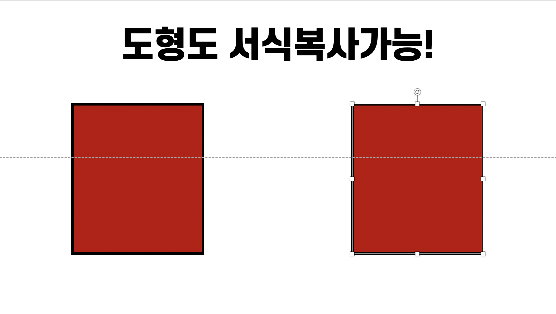 위에서 사용되는 단축키는 폰트뿐만아니라 파워포인트 대부분의 기능에 적용할 수 있다는 사실! 저도 작업 하다가 실수로 눌러서 알게되었어요. 왼쪽의 빨간 네모에 검정색 선으로 둘러진 사각형을 오른쪽에 그대로 적용할 때도 서식 복사와 붙여넣기 단축키를 사용합니다.