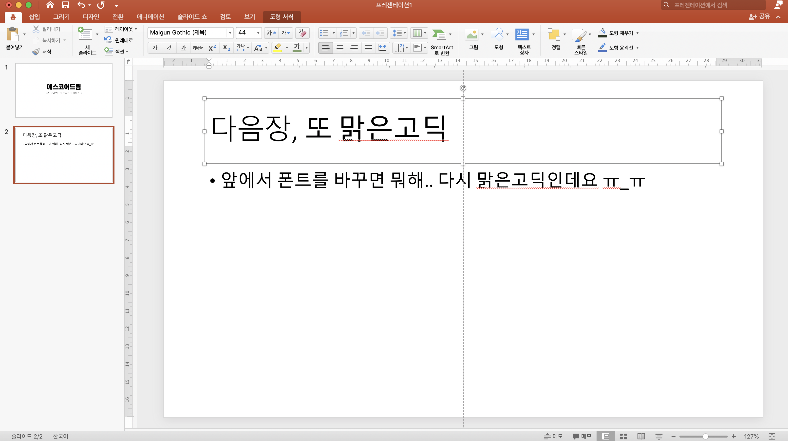 그런데 앞서 폰트를 바꿨는데 다음장을 제작할 때는 다시 기본 템플릿에 기본 폰트, 맑은 고딕이 사용됩니다. 이 말인즉슨 다시 상단의 글꼴 탭에서 내가 원하는 폰트로 바꿔줘야한다는 뜻이죠.