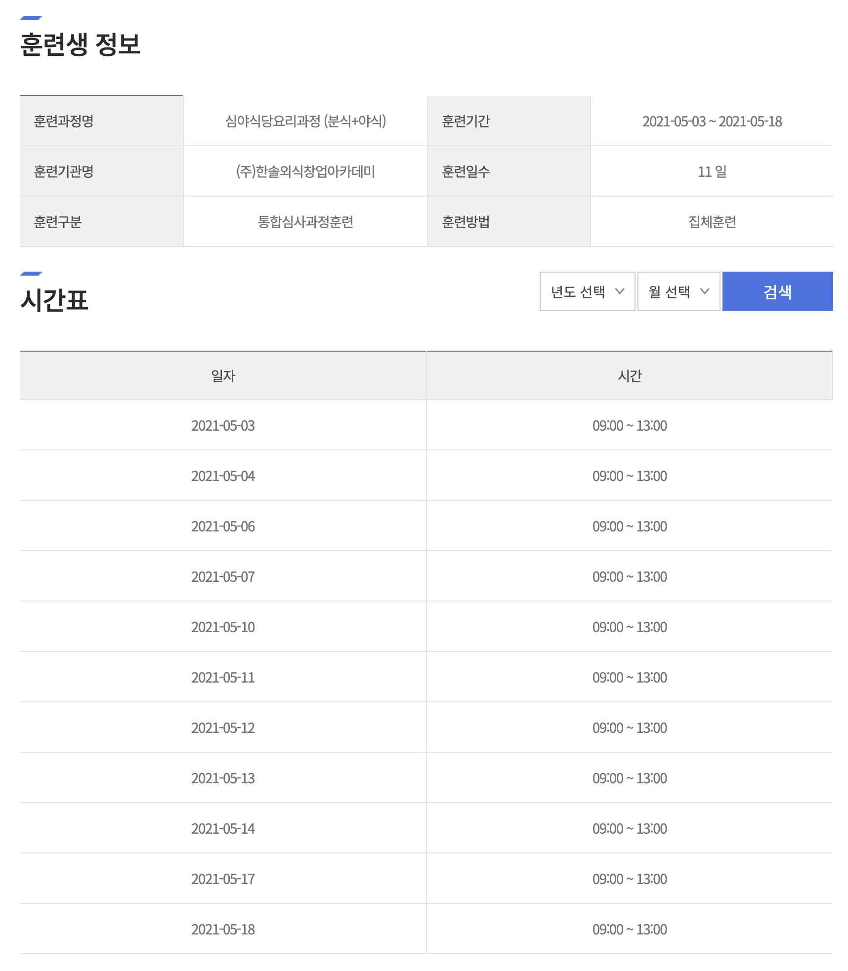 사이트 내에서 조금 아쉽다고 생각하는건 제가 수료한 과정은 [심야식당요리과정(분식+야식)]인데 '요리'라고 치면 또 안나오더라구요.. 그런데 '조리'라고 치면 나오기도하는 부분때문에 분명 수강하고자 하는 과정을 놓치는 분들이 많을 것 같다는 생각이 들었어요.