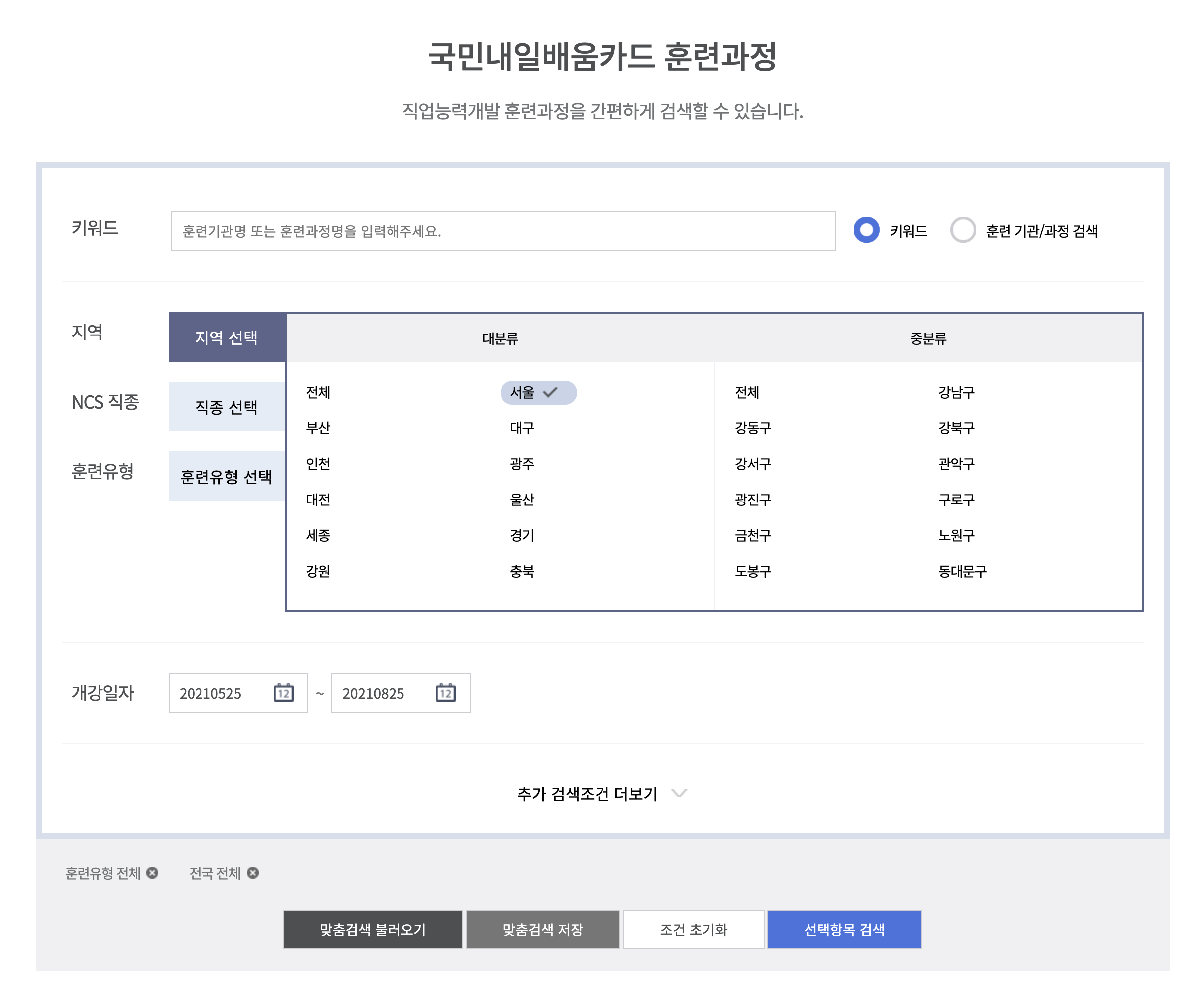 그 이유는 '영등포구'만 선택하고 '요리'라는 키워드를 입력했을 때 얼마 안나오더라구요. 서울로만 체크하고 키워드를 찾았을 땐 많은 과정을 볼 수 있었고 종로 한솔요리학원까지 찾을 수 있었습니다.