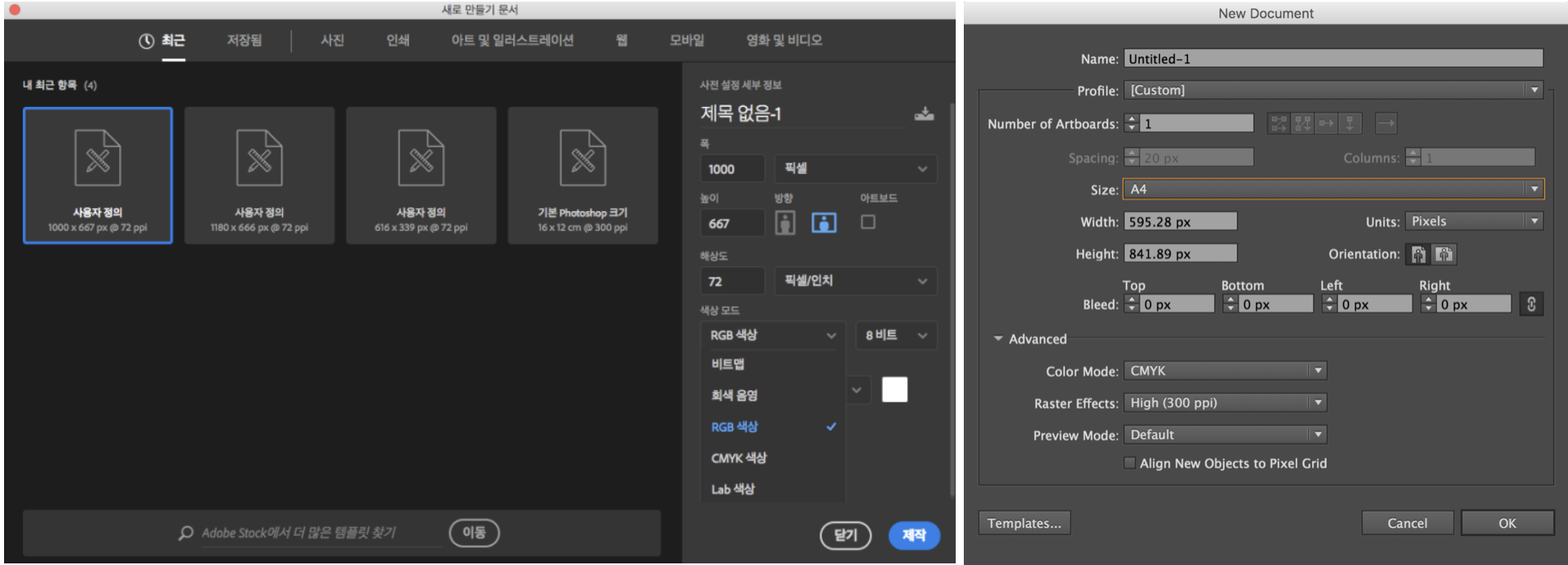 왼쪽이 포토샵이고 오른쪽이 일러스트인데요 Ctrl+N = 새창 열기를 한 모습입니다. '색상 모드, color mode' 보이시죠? 이 패널에서 원하는 목적에 따라서 색상모드를 RGB나 CMYK로 바꿔서 사용할 수 있어요!