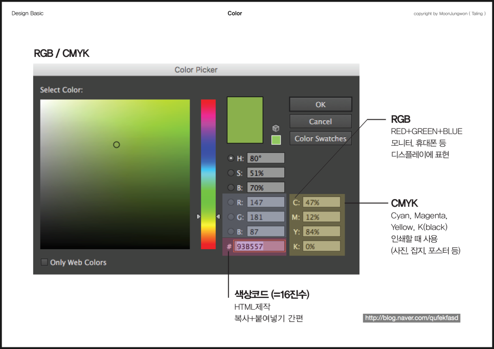 위 이미지는 제가 가르치는 일러스트와 포토샵 강의에서 디자인에서 꼭 알아야 할 주제인 '색상(COLOR)'에 대해 가르칠 때 쓰는 자료인데요, 딱 두 가지만 알면 됩니다.