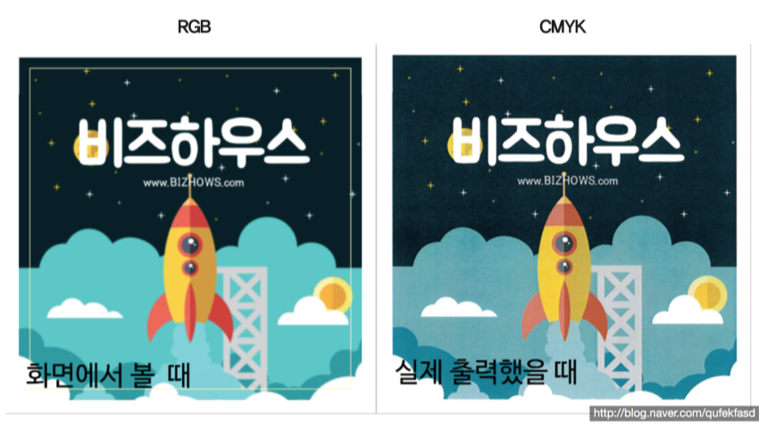 일러스트나 포토샵은 노트북이나 아이패와 같은 왼쪽처럼 화면에서 보는 색상(RGB)으로 켜놓고 작업을 합니다. 하지만 막상 인쇄물로 뽑으니까 오른쪽처럼(CMYK) 탁해지죠. 그럼 이제 인쇄비 날리고~~~~ 아 내가 원하는 색상 아닌데~~~~~작업 또다시~~~~~ 생각만 해도 끔찍합니다. 흑흑