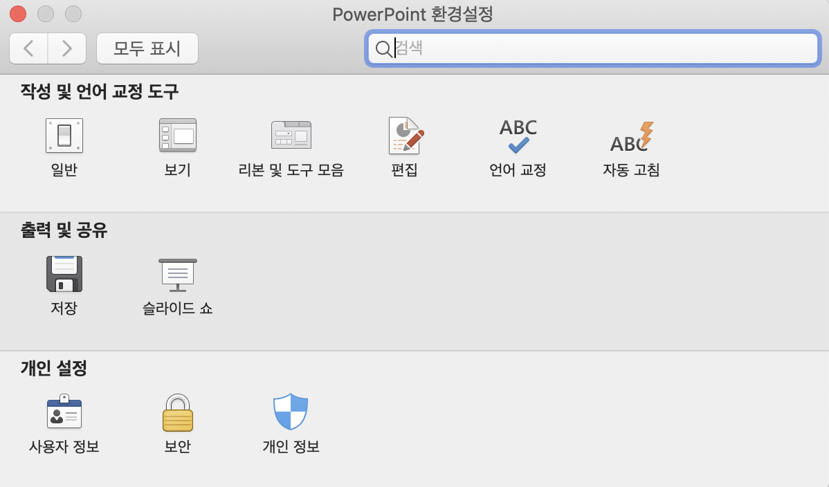 맥에서 글꼴포함 저장을 하려면 상단 탭에서 [PowerPoint - 기본설정 -(출력 및 공유)저장]의 루트로 들어가야합니다.