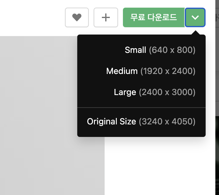 언스플래쉬는 따로 로그인을 하지 않아도 고화질의 이미지를 다운로드할 수 있습니다. 그것도 스몰, 미디엄, 라치, 오리지널 4개의 사이즈로 말이죠! 따로 용량 걱정 안 해도 되고, 번거롭게 로그인하면서 시간낭비 안해도 되니까 얼마나 좋은 사이트입니까!