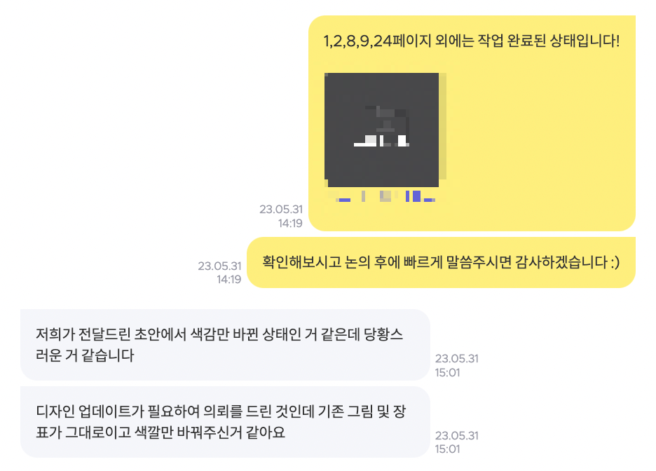 3) 저는 이미 7일동안 초안을 콘셉트로 작업을 진행한 상태였고, 디자인을 의뢰받은 28장 중 5장을 제외하고(23장)는 모두 작업을 완료한 상태였습니다. 그래서 지금까지 작업한 작업물을 확인해보고, 만약 디자인 스타일이 마음에 안 든다면 다른 의뢰인께 의뢰하는 게 어떻겠냐고 제안드렸습니다. 이에 의뢰인은 작업물을 보내주면 확인 후 내부 논의를 하겠다고 답변하였습니다.