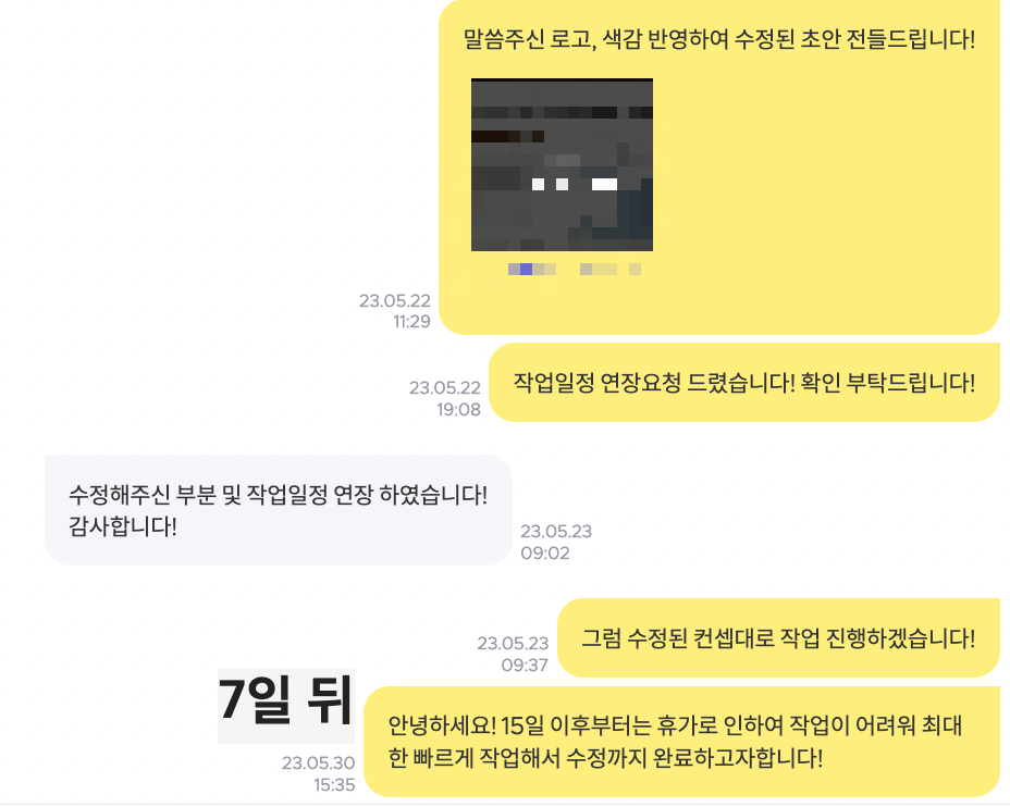 1) 의뢰인과의 작업 이후 잡아놓은 휴가 일정이 있었고, 추가 수정에 대해 미리 일정을 조율해야 한다고 판단해서 수정 기간에 대해 논의하고자 메시지를 발송하였습니다.