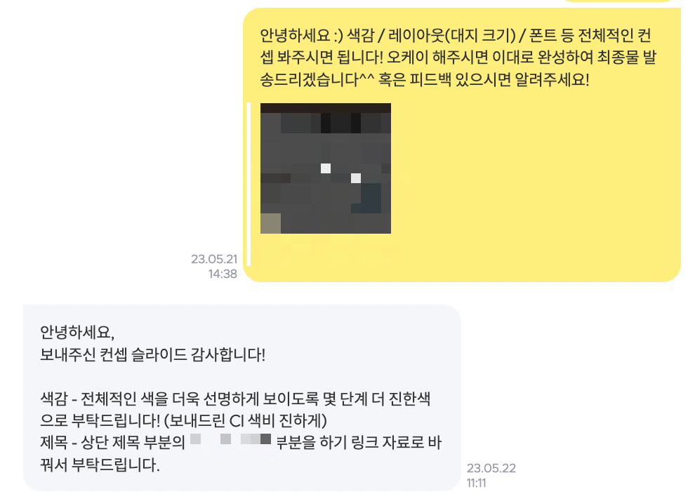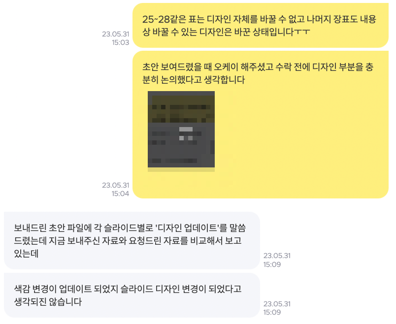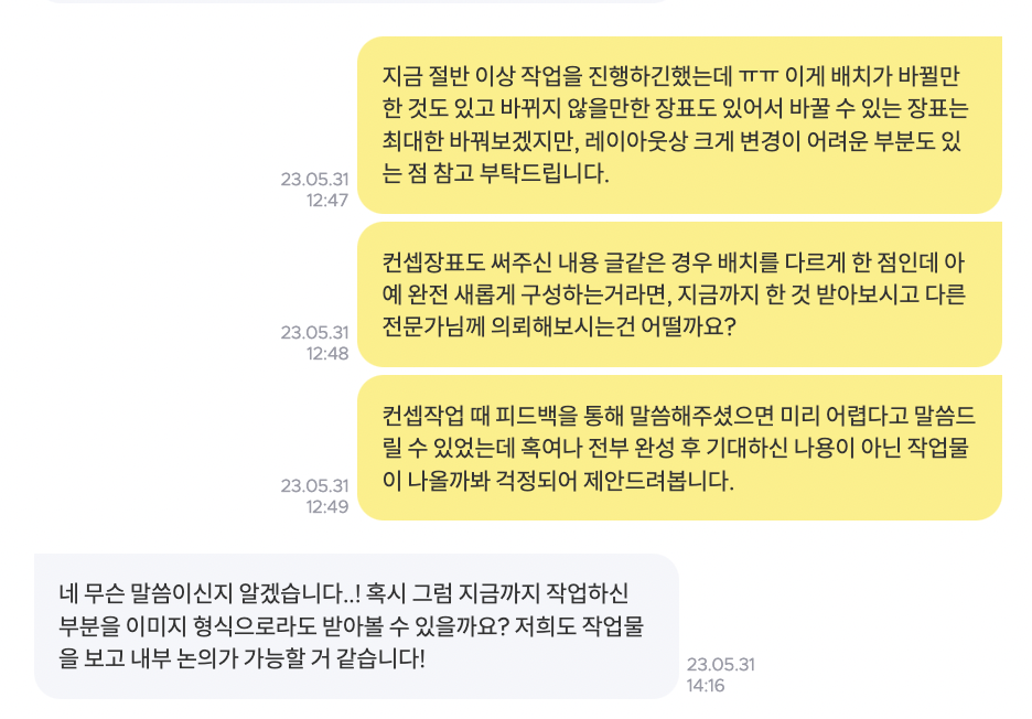 2) 일정 얘기 중, 의뢰인이 7일 전에 확정했던 컨셉 슬라이드에 대해 "내부 논의 결과, 배치는 그대로고 디자인만 바뀐 것 같다"는 피드백을 받았다면서 아예 다르게 디자인을 해달라고 요청했습니다.
