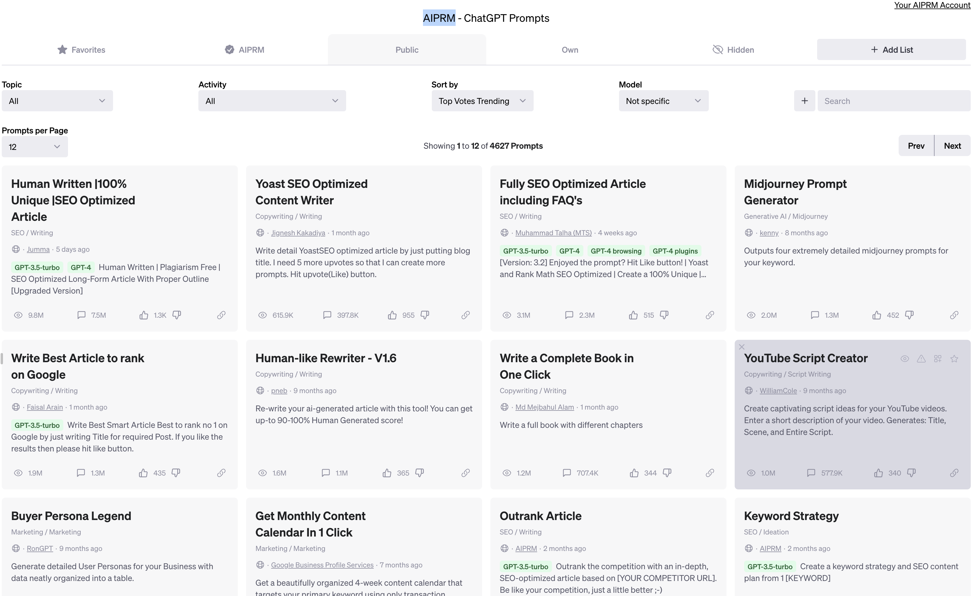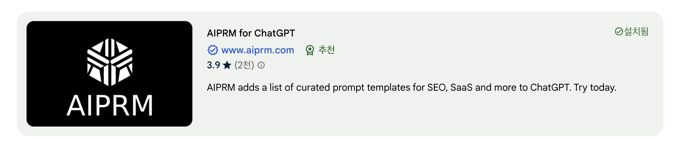 여기서 [AIPRM]을 검색해준다음, 위 이미지와 같은 확장 프로그램을 설치해줍니다. 그 뒤에 다시 chatGPT로 접속하면 화면이 바뀌어있을거에요.