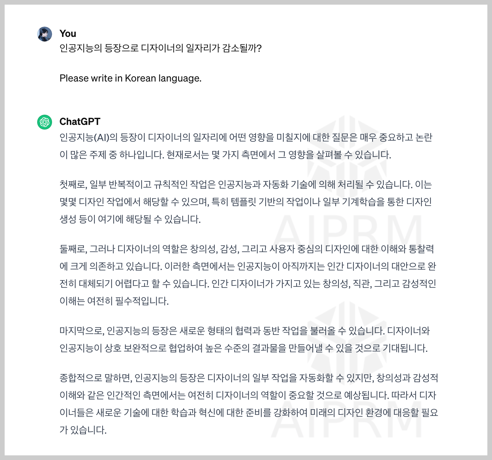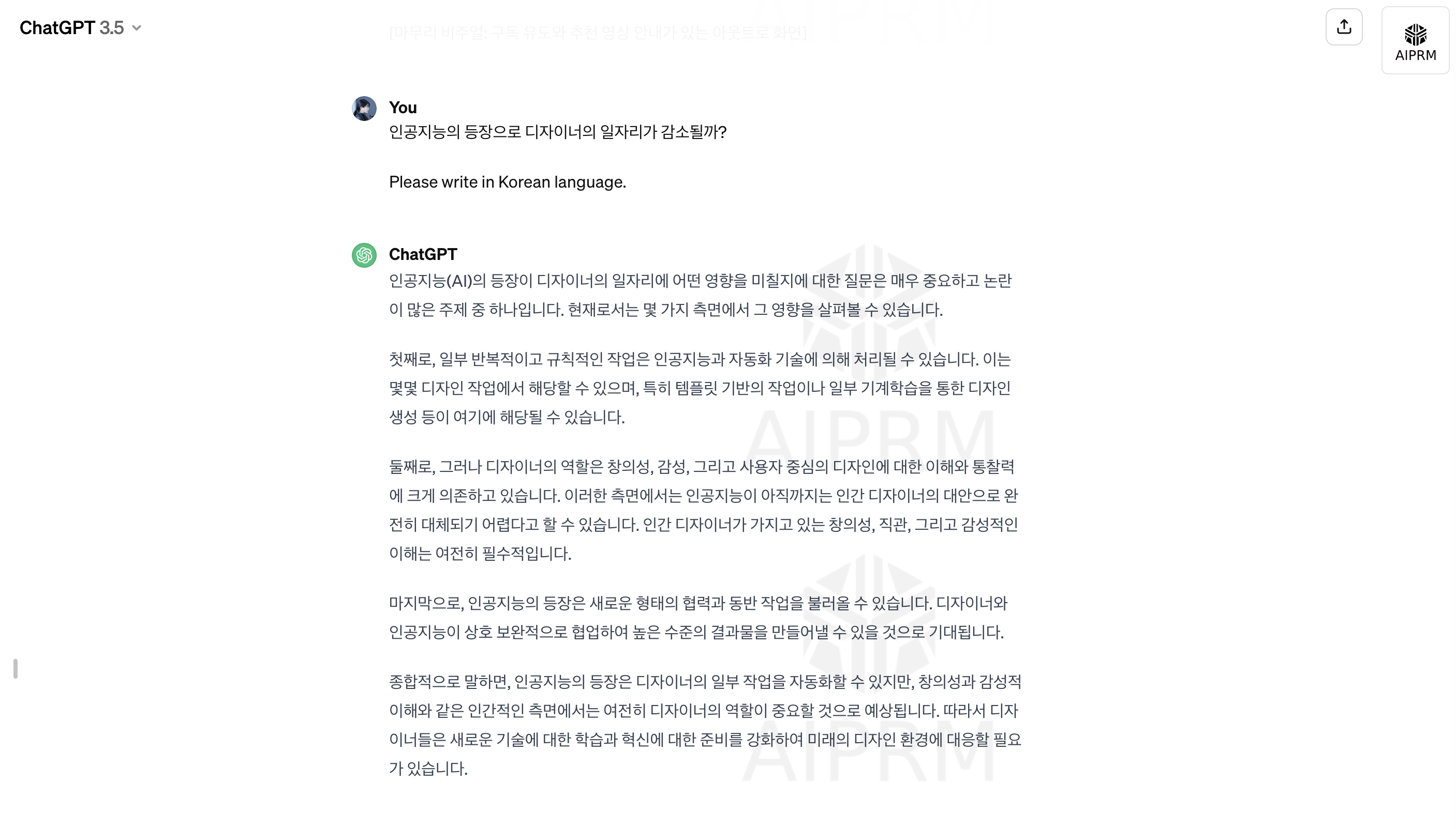 저는 조금 더 정확하고 솔직한 답변을 듣기 위해서 ChatGPT 3.5에 AIPRM 확장자를 추가해서 “인공지능의 등장으로 디자이너의 일자리가 감소될까?”라고 질문해봤습니다.