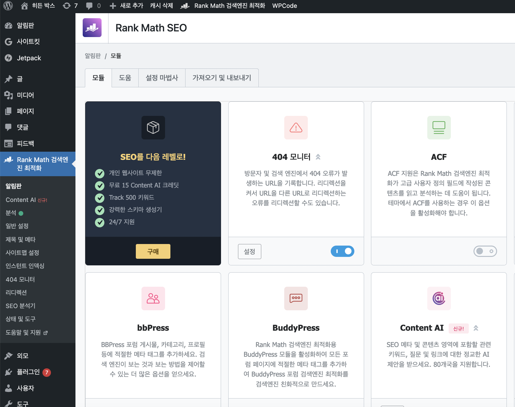 워드프레스 기본 블로그에는 저 SEO 지수가 안나온다. 따로 플러그인을 설치해야한다. Rank Math 검색엔진 최적화 라고 하는 플러그인을 설치 후에 활성화하면 글을 쓸 때 저 지수를 즉각적으로 확인하면서 글을 쓰거나 수정할 수 있다!