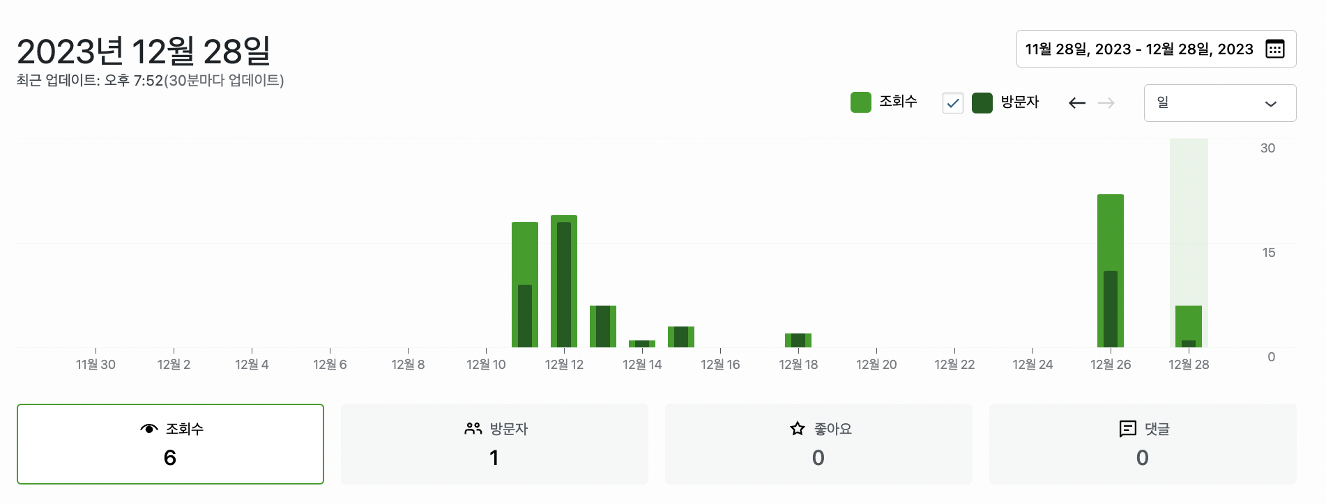 사실 그동안 조회수가 너무 처참했다. 첫 날 빼고 글을 하루에 하나씩 올려도 조회수, 방문자수가 0명인 적도 많았다. 위에 그래프가 개설하고 이 글을 쓴 지금 시점까지, 글 18개가 올라간 워드프레스 블로그의 조회수 방문자 실적인데ㅋㅋㅋㅋ 0명인 적이 4명이다.. 그리고 방문한 사람들을 보면 국적이 말레이시아, 미국, 대만과 같이 이상하게 외국인 분들이 들어오셨고, 한국인은 몇 명 없었음.