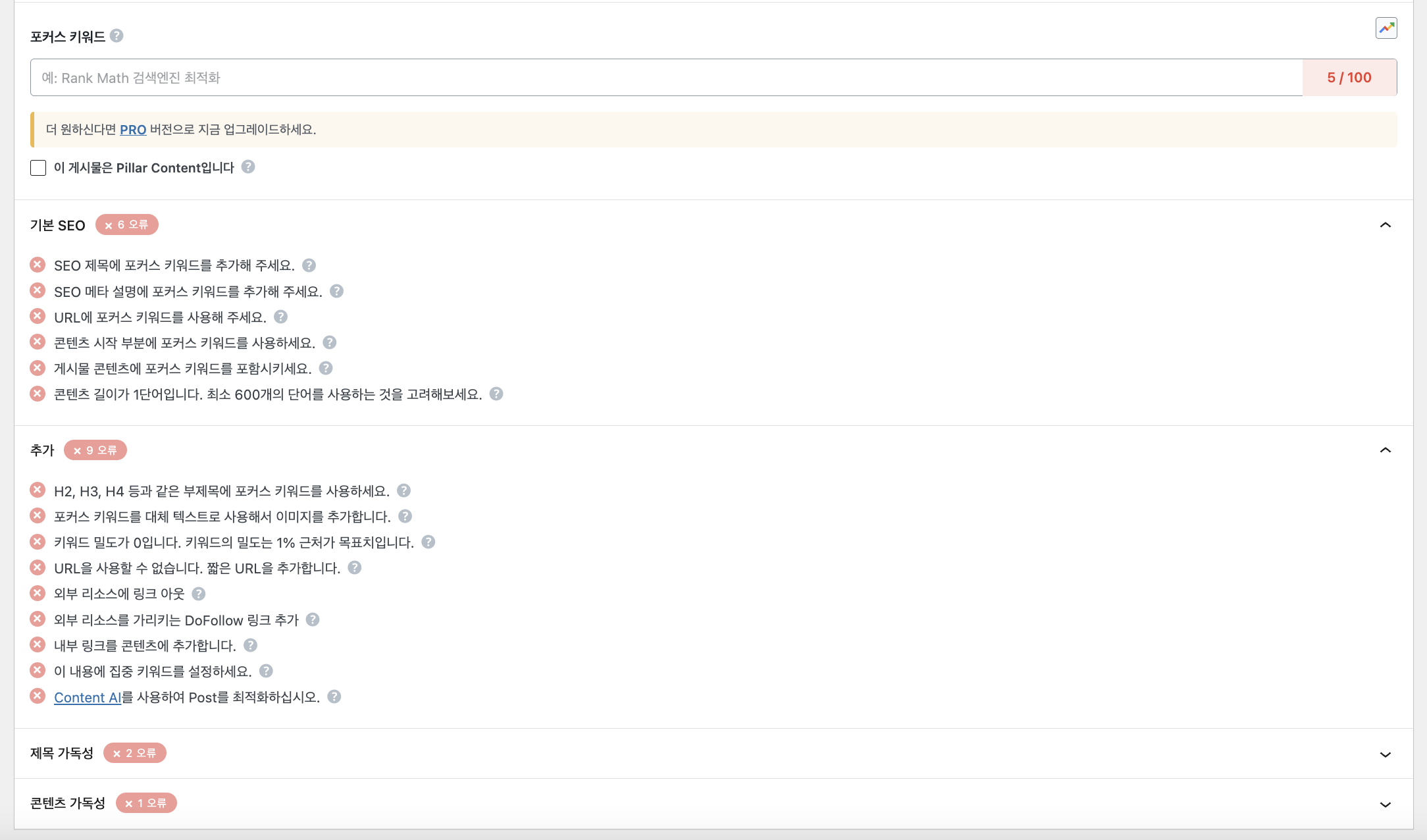 글쓰기 하단에 이런식으로 충족되지 않은 것들을 알려주고 충족되면 파란불로 바뀌면서 점수가 올라간다! 그 점수가 80점이 넘을 수 있도록 이미지를 많이 추가하거나, 글을 더 쓰거나, 인 아웃바운드 링크를 달아서 점수를 올리곤 한다.