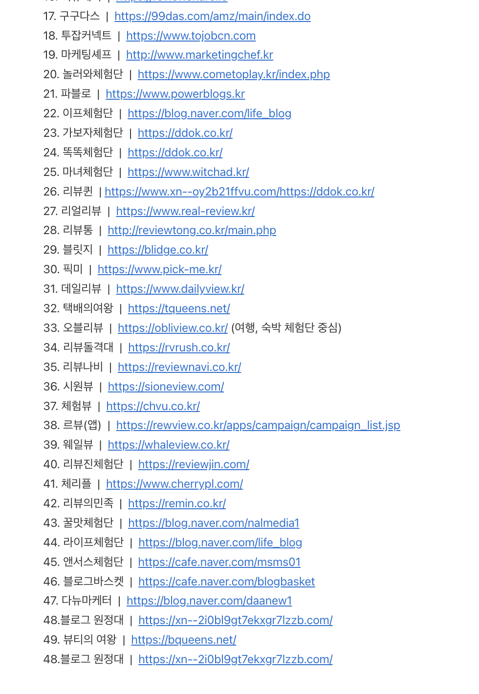 네이버 블로그 체험단 사이트 48개를 모았습니다. 제가 자주 사용하는 네이버 블로그 체험단 사이트도 있지만 정리하면서 처음 알게된, 신생 네이버 블로그 체험단 사이트를 많이 볼 수 있었어요. 따로 회원가입을 해야하는 사이트 말고도 블로그나 카페에서 신청하는 체험단도 모아두었습니다.