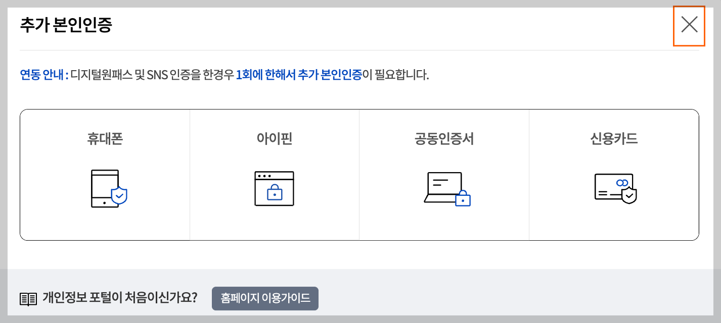 추가 본인인증도 1번 진행해야합니다. 휴대폰, 아이핀, 공동인증서, 신용카드 추가 인증이 가능합니다.