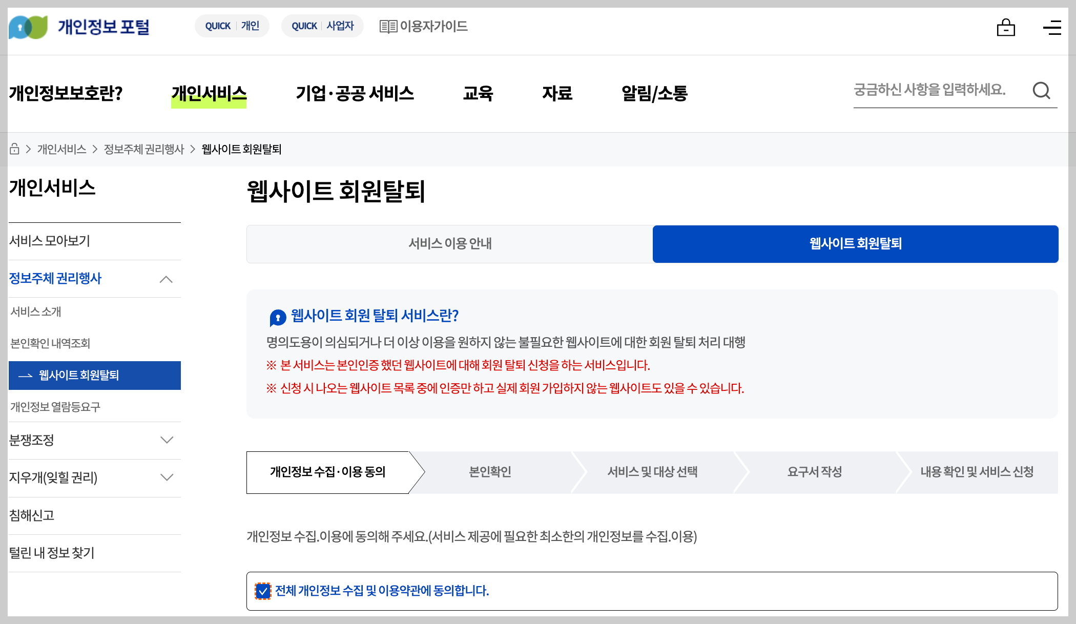 웹사이트 회원탈퇴 항목에서 개인정보 수입과 이용에 동의해주세요.