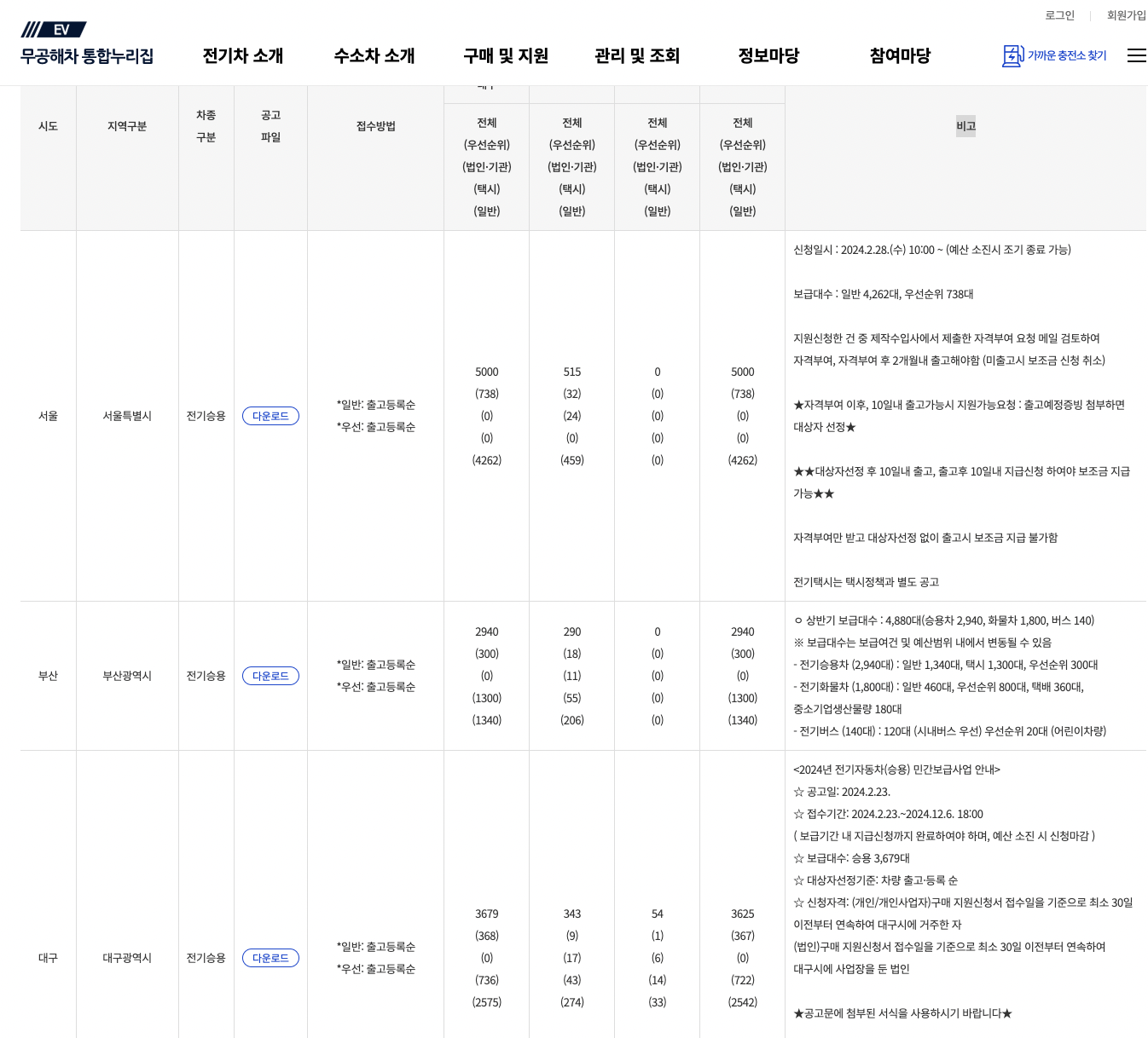 <2024년도 전기자동차(승용,화물,승합) 보급사업 공고(1차)> 1. 신청기간 : 2024. 2. 26. 10:00 ~ *예산 소진 시 조기종료 2. 보급대수(1차) : 448대(승용 205대, 화물 242대, 승합 1대) * 2024년도 총 보급대수 : 승용 294대, 화물 346대, 승합 1대 * 보급대수는 차종별 지원금액 차이 및 추가보조금 등 예산범위 내에서 변동 될 수 있음 |